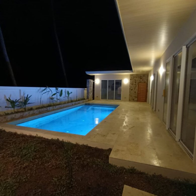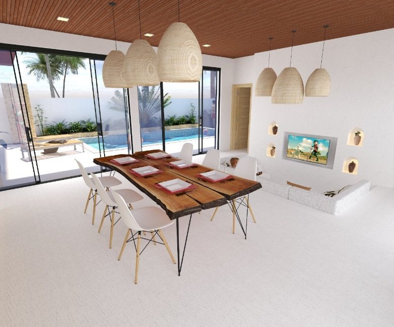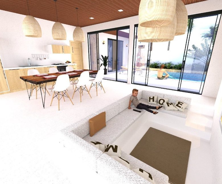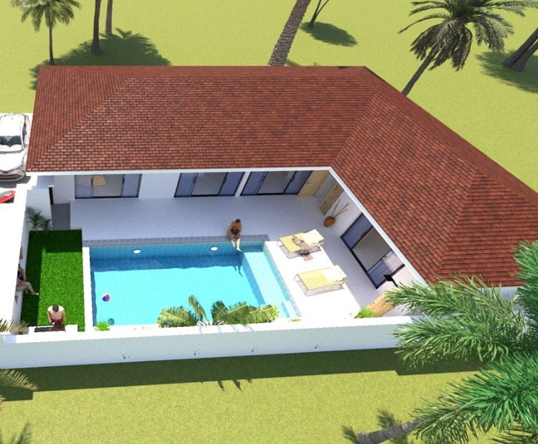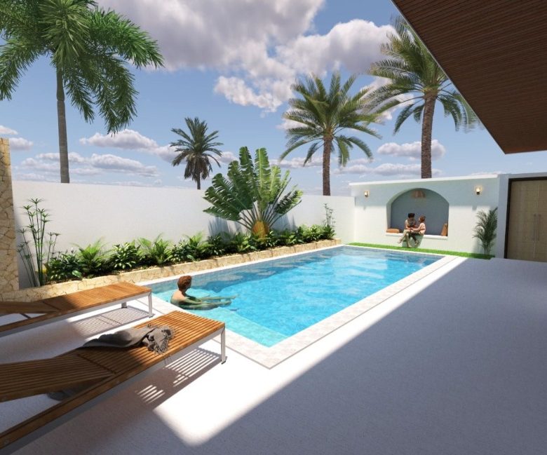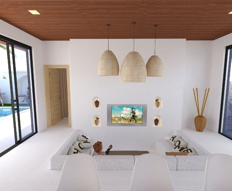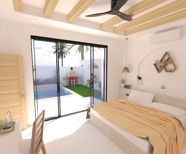 On a plot of 300 mÂē, these fully fenced villas have a built area of ââ211 mÂē with a living area of ââ120 mÂē. They have 3 bedrooms, 3 bathrooms, a spacious and bright living room with dining area, open to a fully equipped European style kitchen with storage, oven, gas stove, extractor, sink and refrigerator.