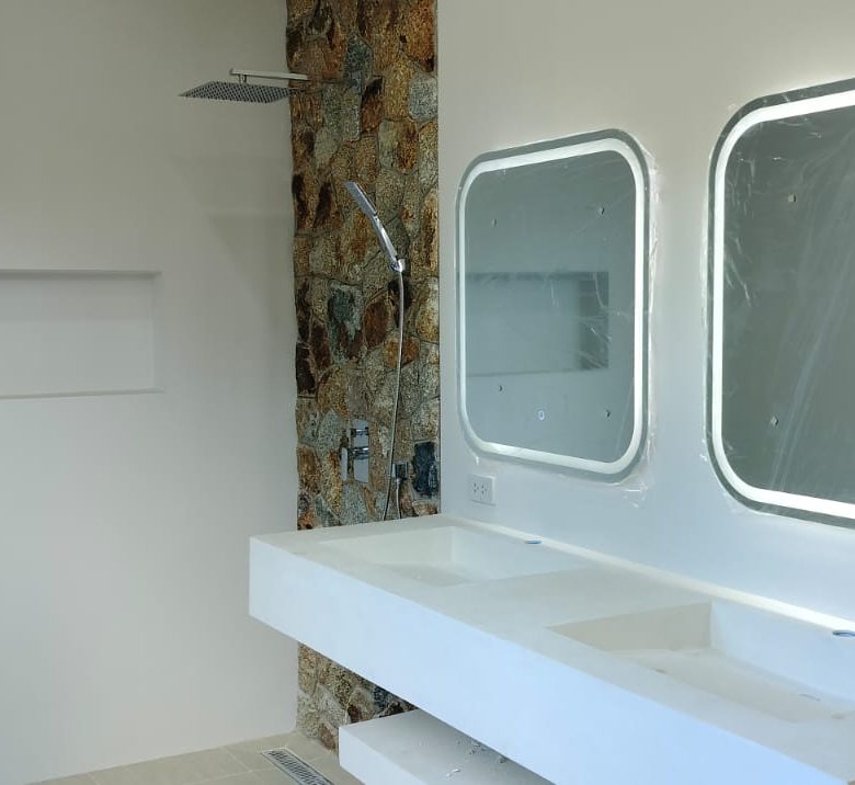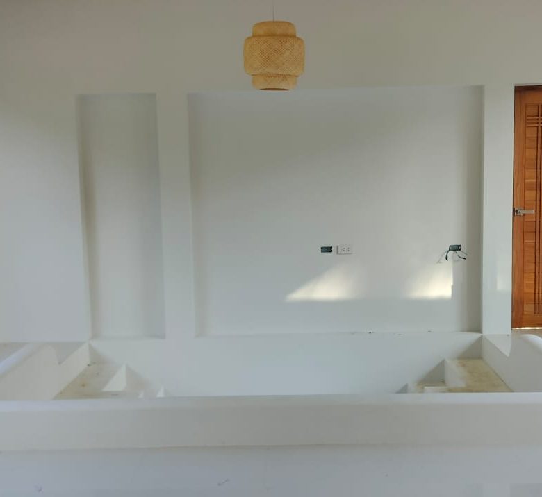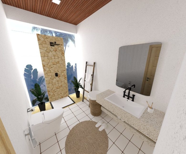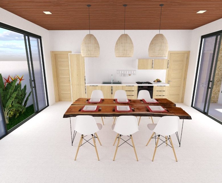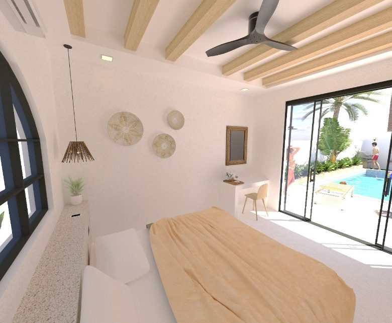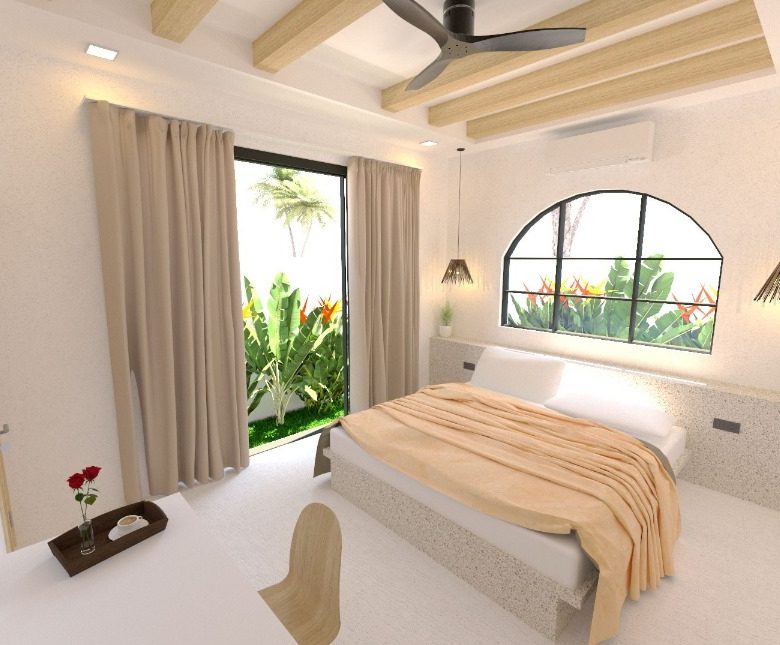 On a plot of 300 mÂē, these fully fenced villas have a built area of ââ211 mÂē with a living area of ââ120 mÂē. They have 3 bedrooms, 3 bathrooms, a spacious and bright living room with dining area, open to a fully equipped European style kitchen with storage, oven, gas stove, extractor, sink and refrigerator.