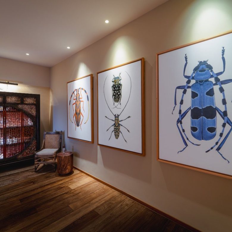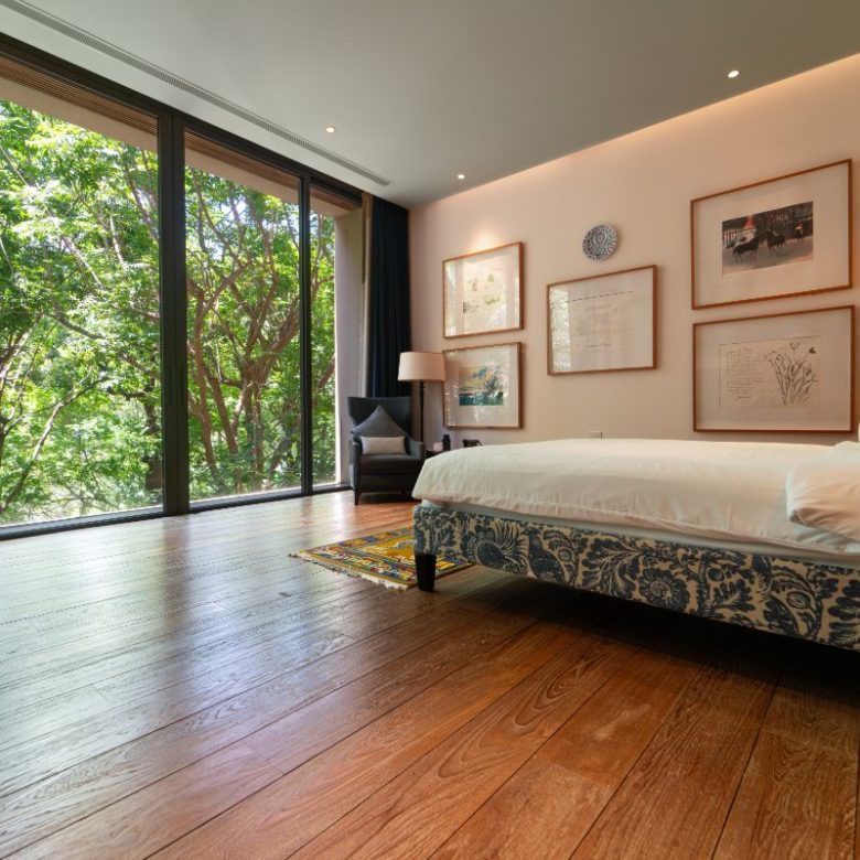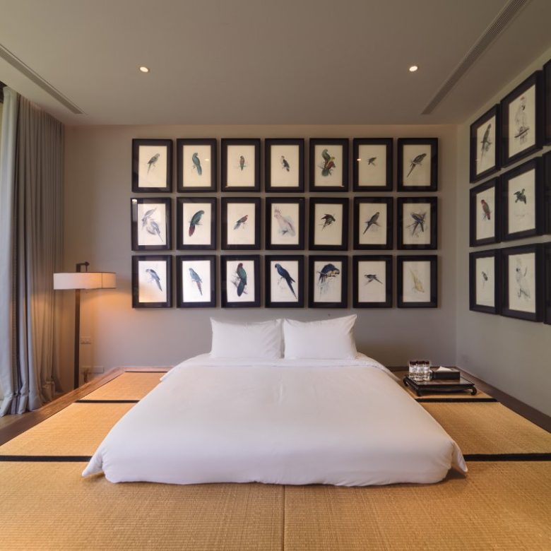 Reminiscent of Japanese tatami-style rooms, three single beds rest on an extended wooden raised platform, surrounded by framed watercolours of exotic birds. A great room for children, it has ceiling-high glass sliding doors that open onto a small private balcony with views of the gardenâs tropical trees and plants.