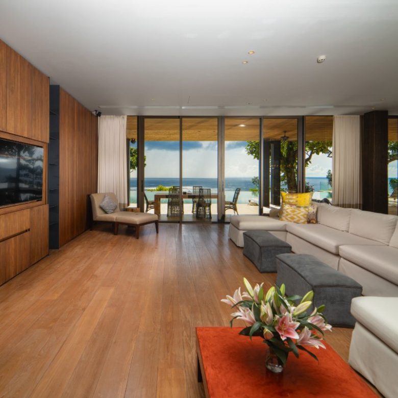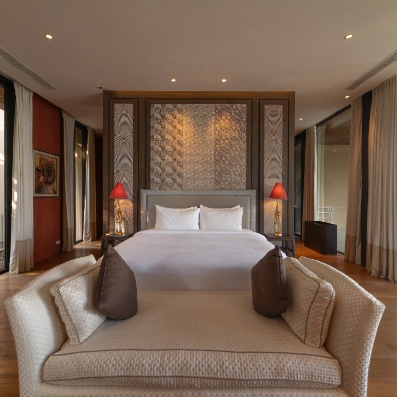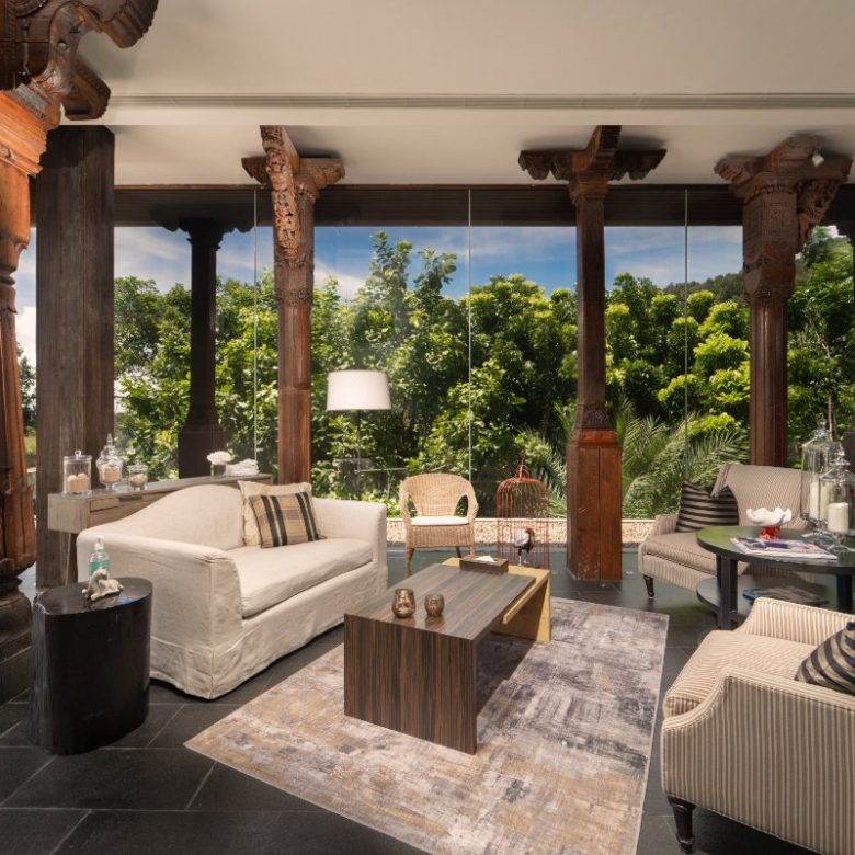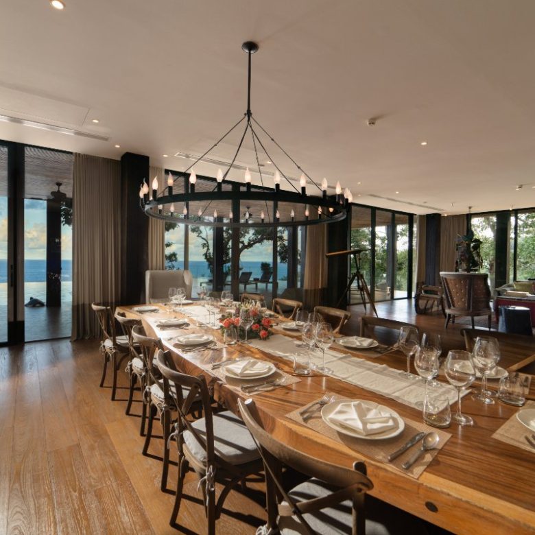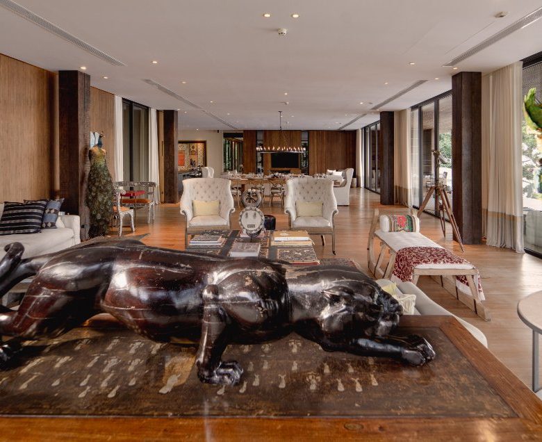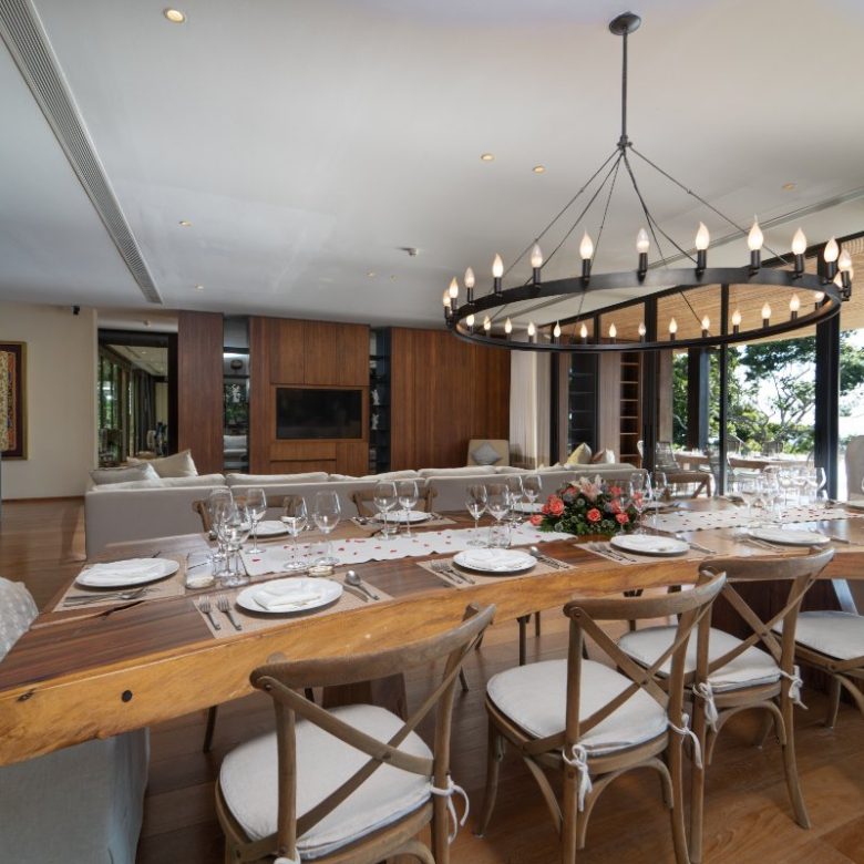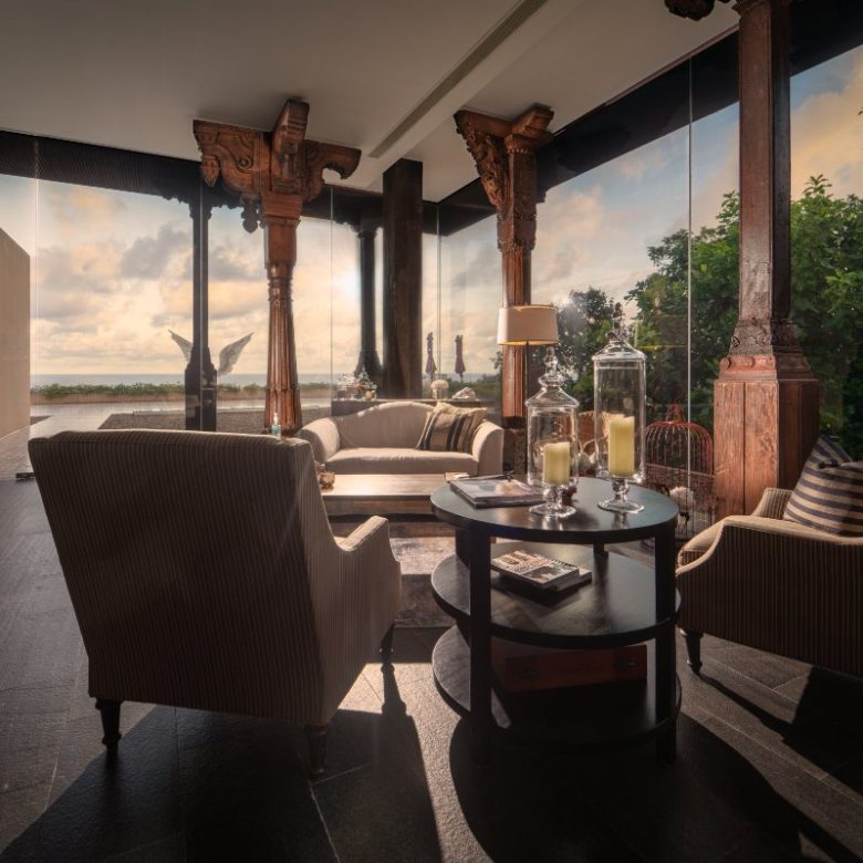 The villaâs lobby offers fantastic sea views through the ceiling-high glass windows, flanked by ancient wood carved Indian pillars. Stairs and a lift connect to the lower two levels, where the wide sandstone-wall corridors connect the living spaces. The airy, open-plan living and dining area is the social hub of the villa, a casual and comfortable setting with an oversized L-shaped sofa facing the TV, a solid wood dining table for 15 guests with a large, chic chandelier, and two more sofas and a collection of glamorous wingback armchairs arranged around a coffee table. This room also features a full-service kitchen and a breakfast bar, perfect for that first cup of coffee. Just off the living room is a fitness studio with gym equipment and yoga mats.