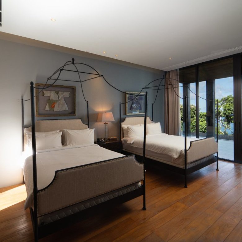 Next door to the master suite Coral, this elegant guest bedroom is furnished with two wrought-iron four-poster queen beds and a comfortable sofa. Built for the ownerâs twin children, there is ample space and a walk-in dressing area with a writing desk and individual closets leading to the ensuite bathroom. The large sheltered terrace is ideal for admiring the vast sea views.