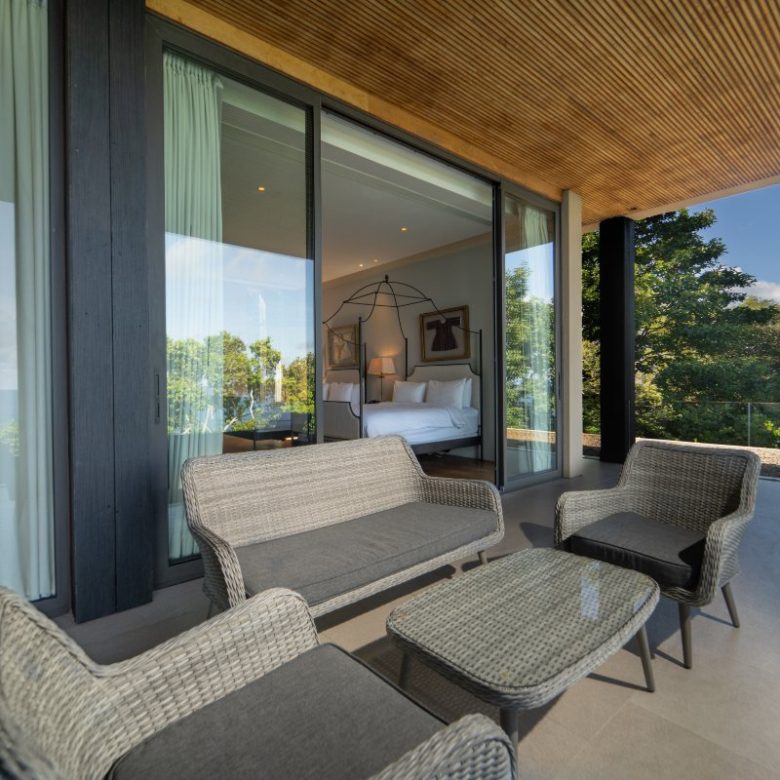 A king-sized bed featuring an upholstered headboard with blue and white hues takes centre stage in this bright, airy room on the second floor of the villa. Sliding glass doors open up onto a sheltered garden-view balcony overlooking frangipani and palm trees.