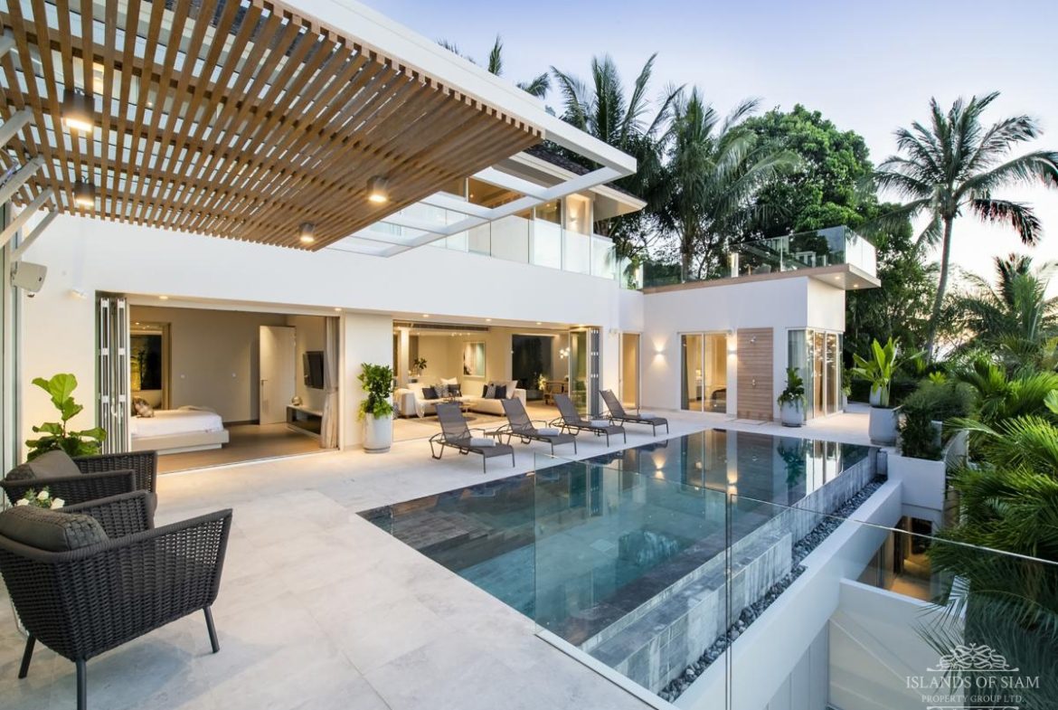 With an emphasis on outdoor living, the boutique villa is designed around its 10-metre infinity pool and white marble terrace, furnished with comfortable sun loungers and a shaded pergola. On the second level the moon deck, a wooden viewing platform, is ideal for sunset cocktails.
