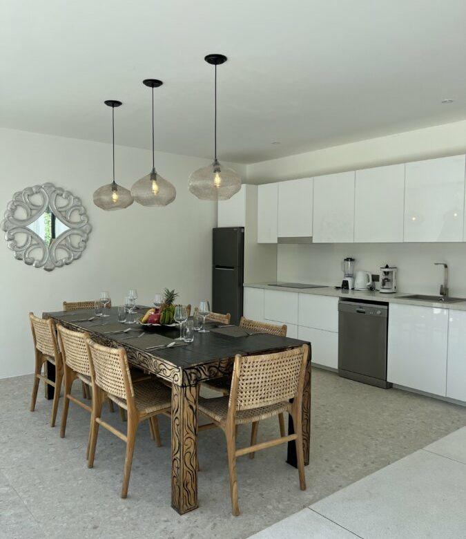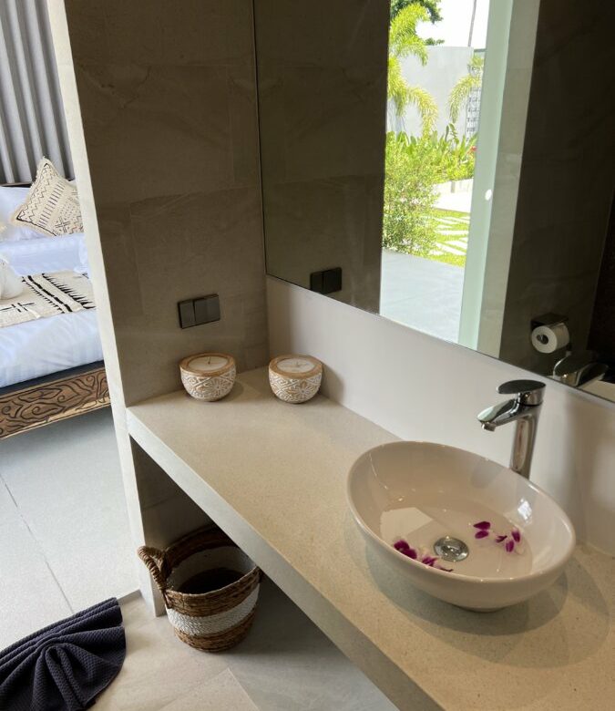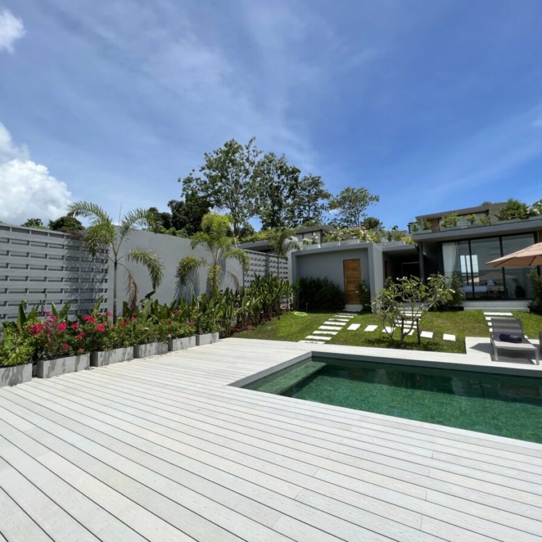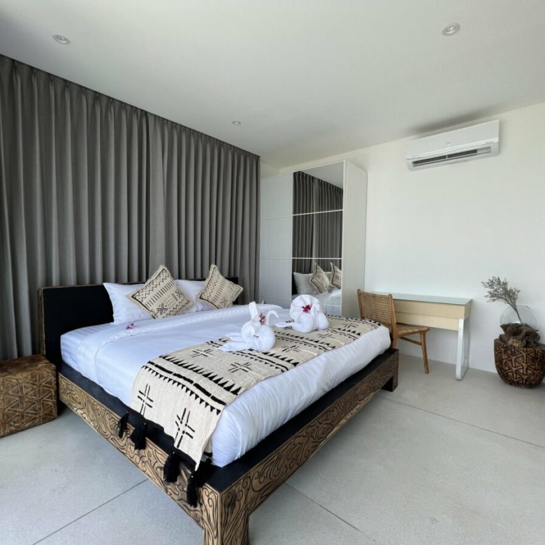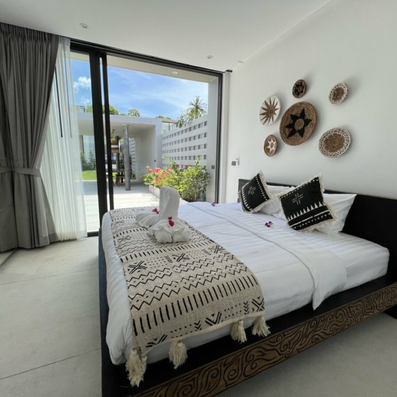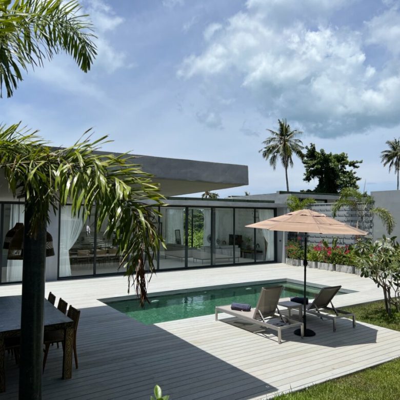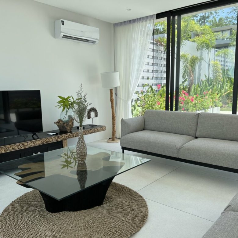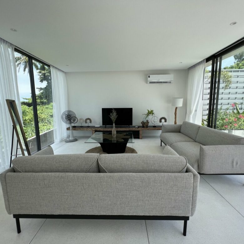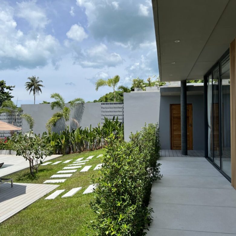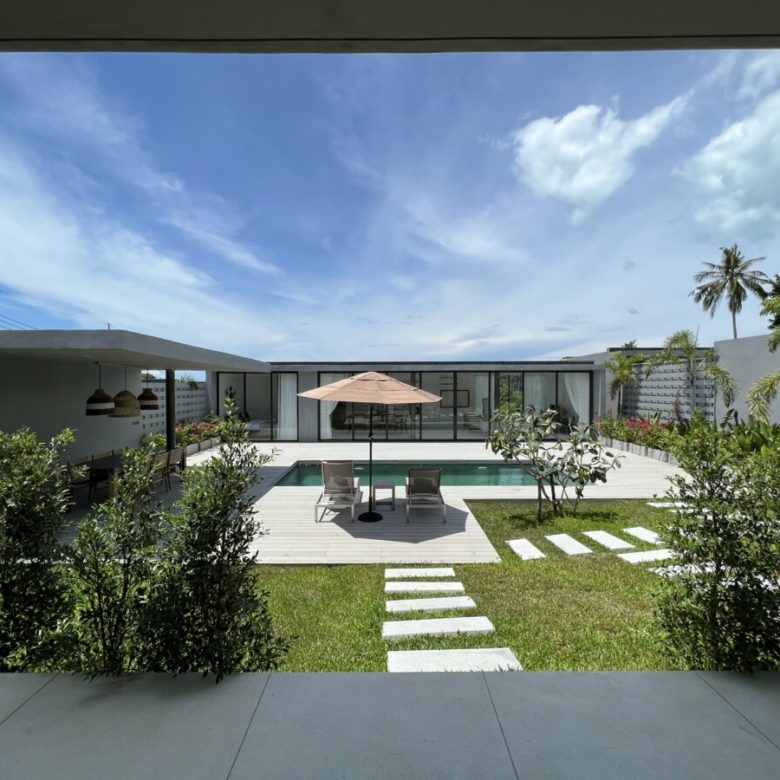 This comfortable 3-bedroom villa offers a private pool surrounded by a peaceful green garden, creating a relaxing outdoor space to enjoy throughout the day. The living room and all three bedrooms sit around the pool area, each featuring its own bathroom, closet, and desk for added convenience. The villa also includes covered parking at the entrance and is set in a quiet location close to Choeng Mon beach and nearby restaurants.