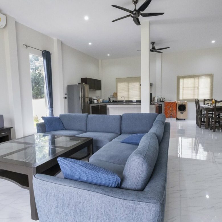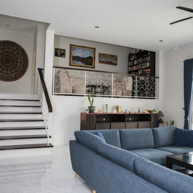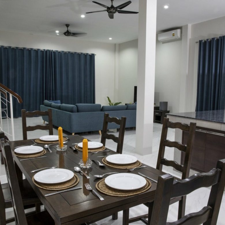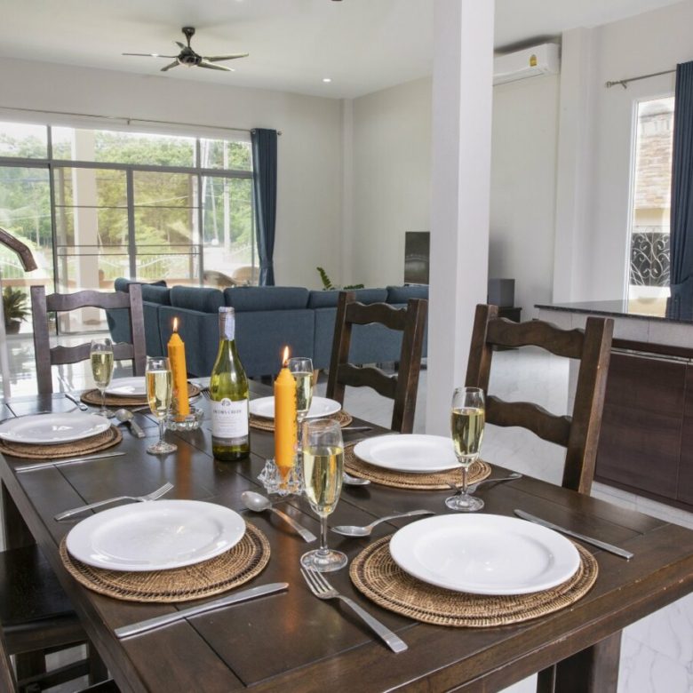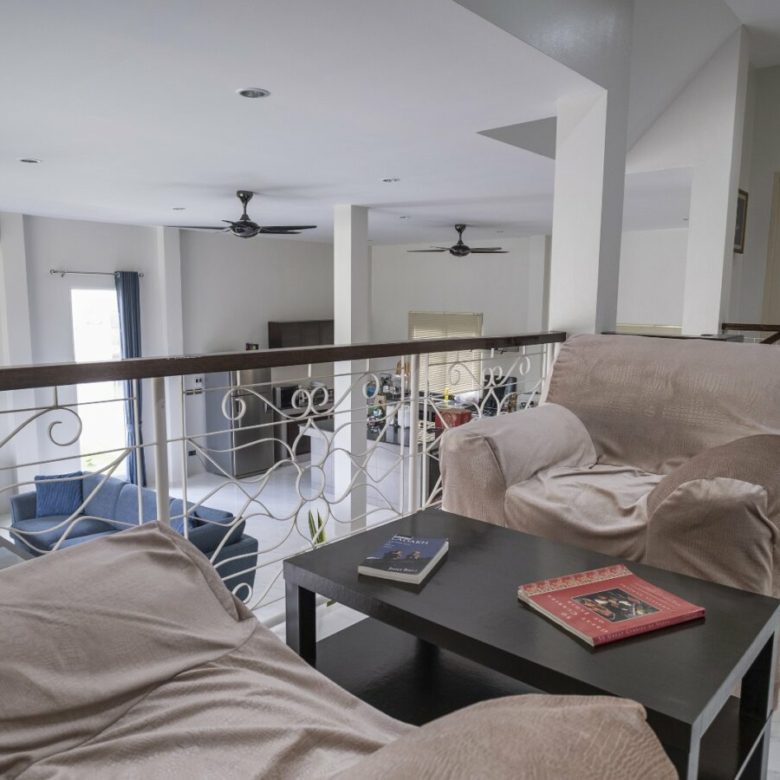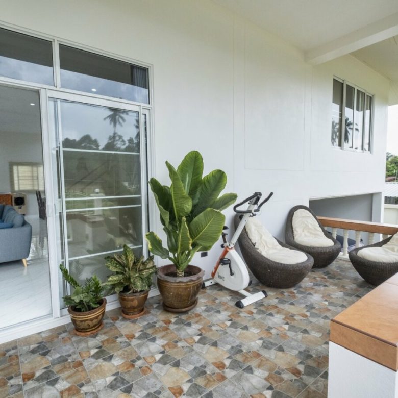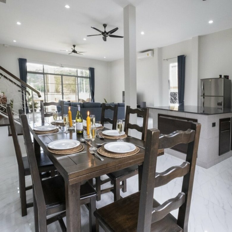 The villa comprises a large open-plan lounge, kitchen fully equipped and dining area, 3 bedrooms, a mezzanine with reading area and library, and a large veranda.