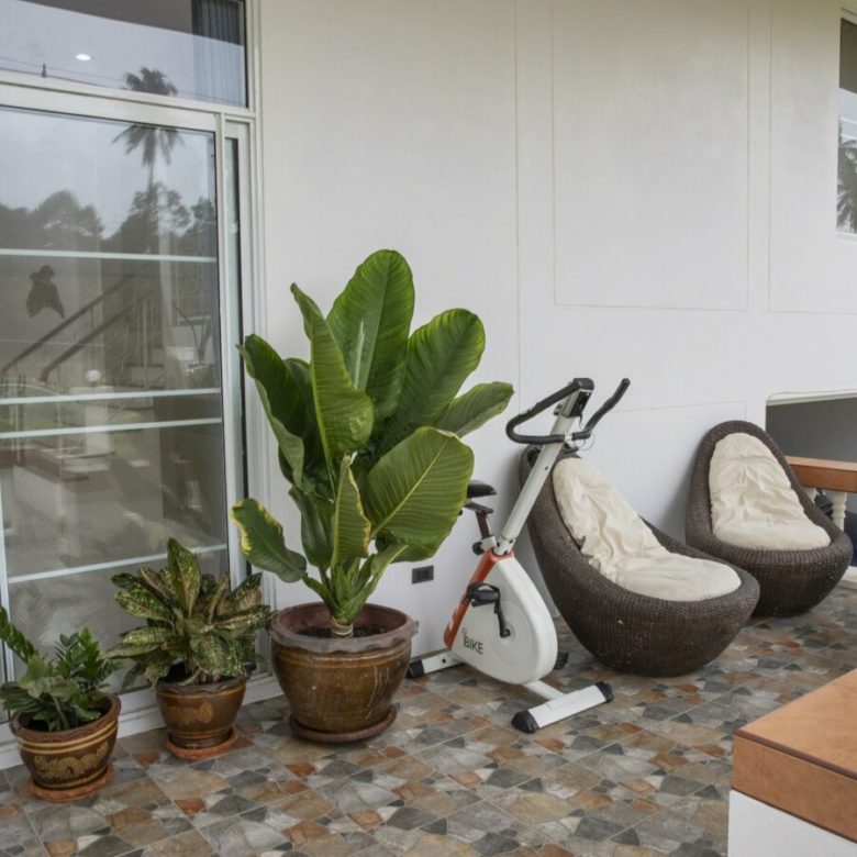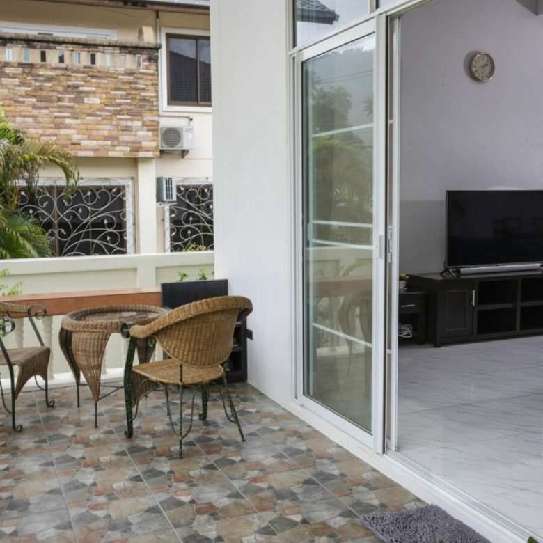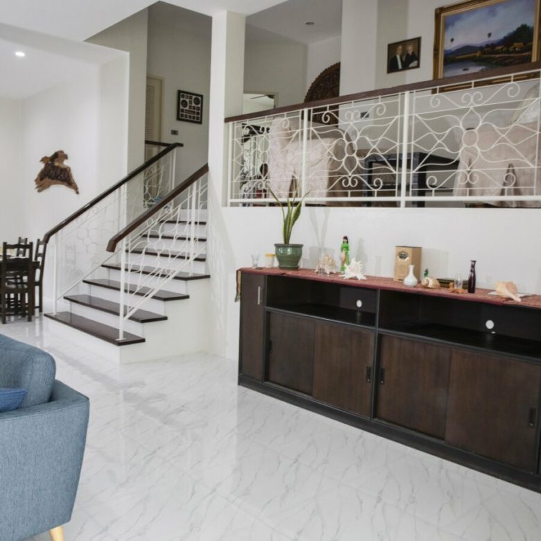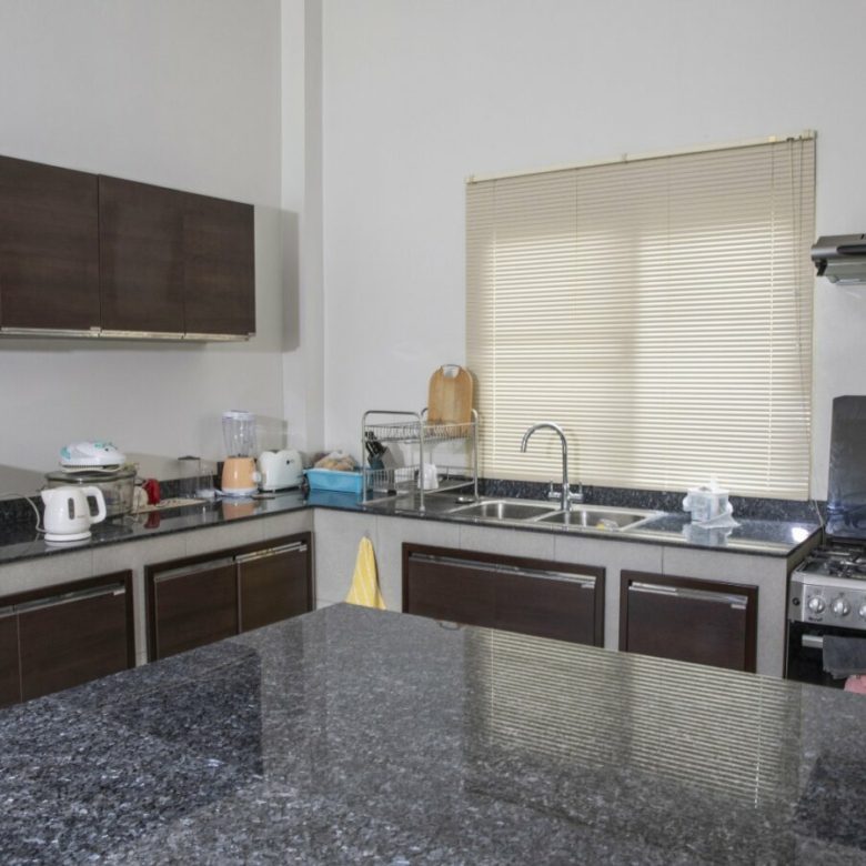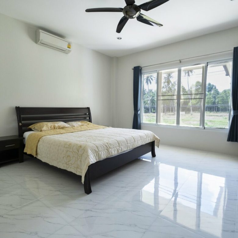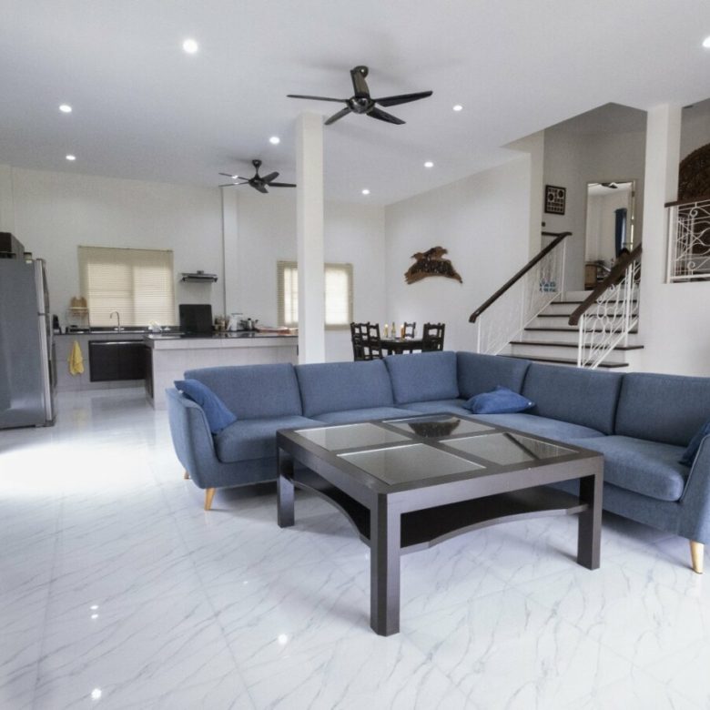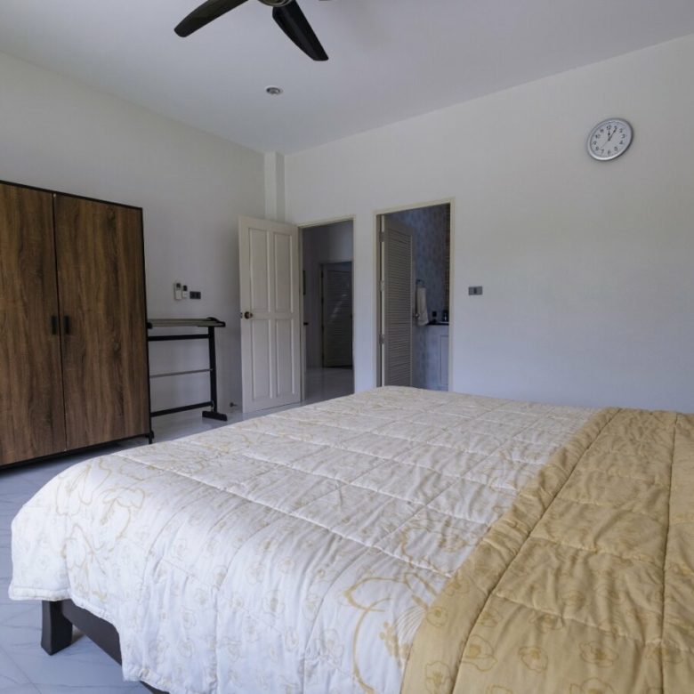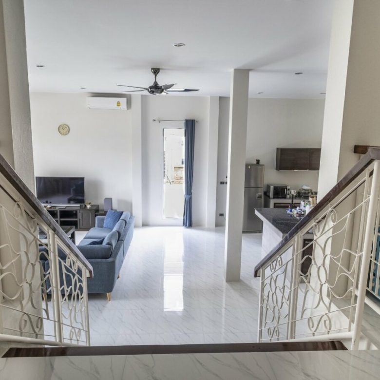 The villa comprises a large open-plan lounge, kitchen fully equipped and dining area, 3 bedrooms, a mezzanine with reading area and library, and a large veranda.