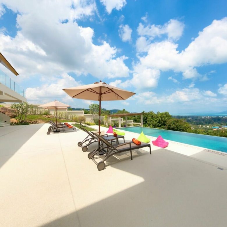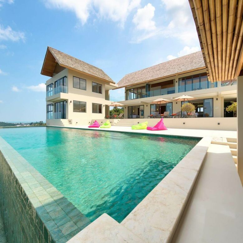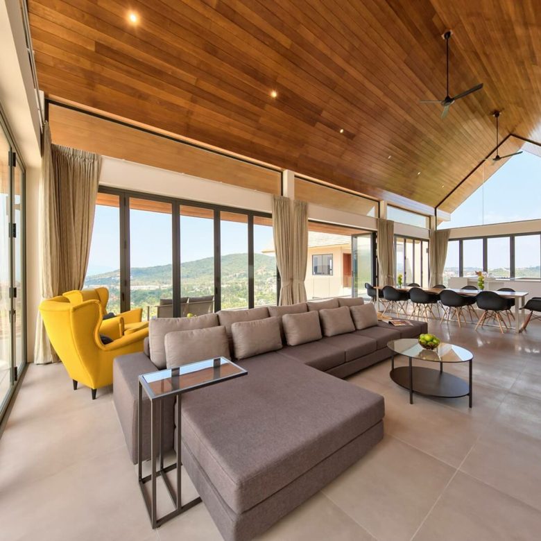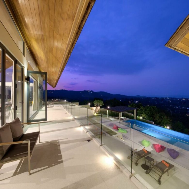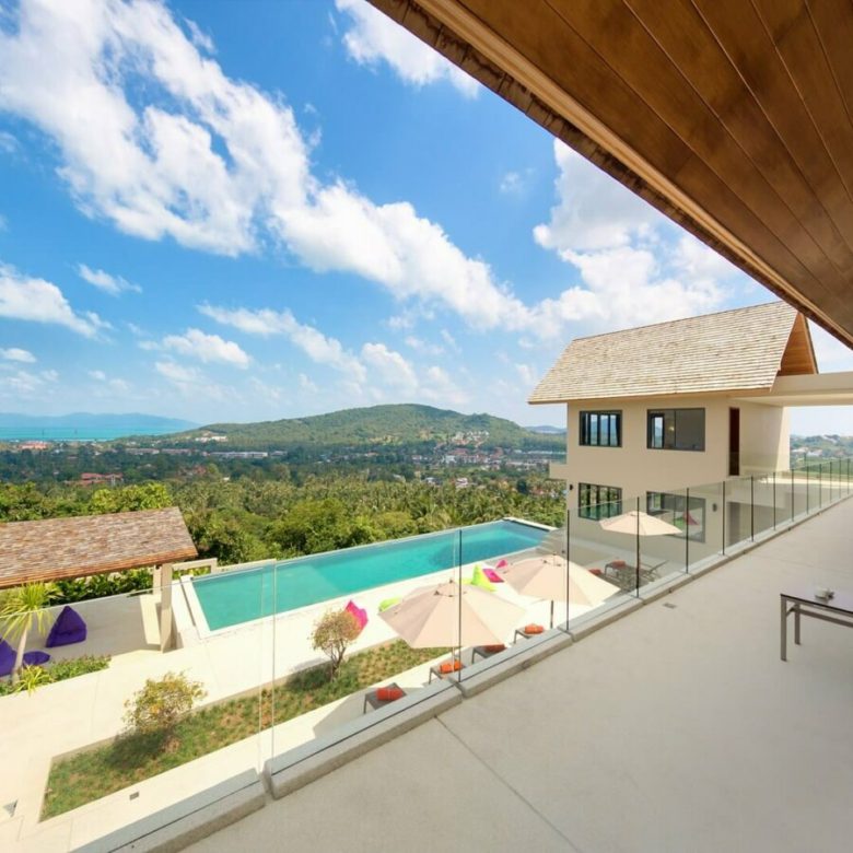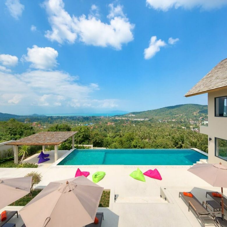 This brand new 6 bedroom villa is located high in the hills of Bo Phut, affording its guests a high quality and stylish standard of living along with stunning panoramic sea views.