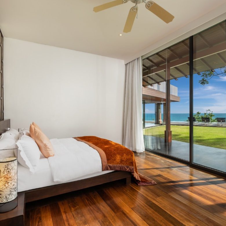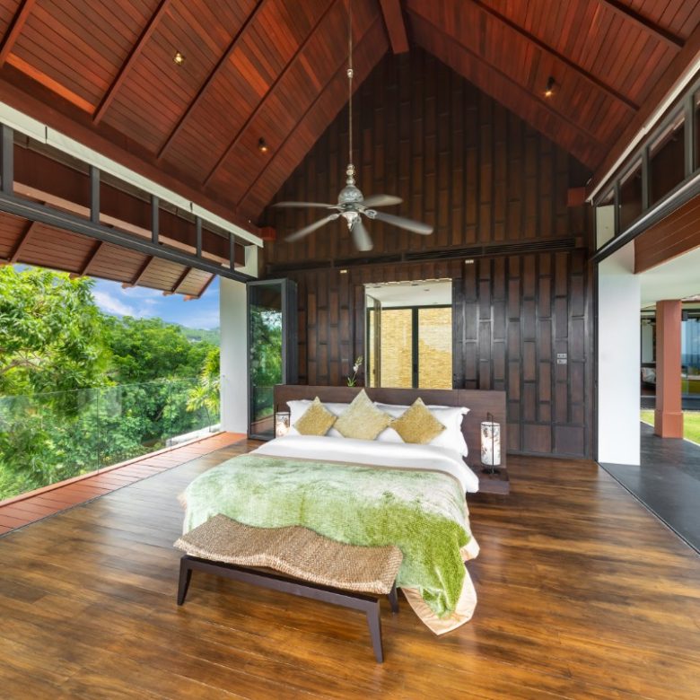On the northern side of the pool level is the master bedroom suite. Itâs forward position provides a high level of privacy, while the three sided floor to ceiling folding/ sliding windows maximize views of the surrounding hills and sea. Once again, this bedroom enjoys huge space, high ceilings, an integrated work desk behind the bed, and both indoor and outdoor shower facilities.