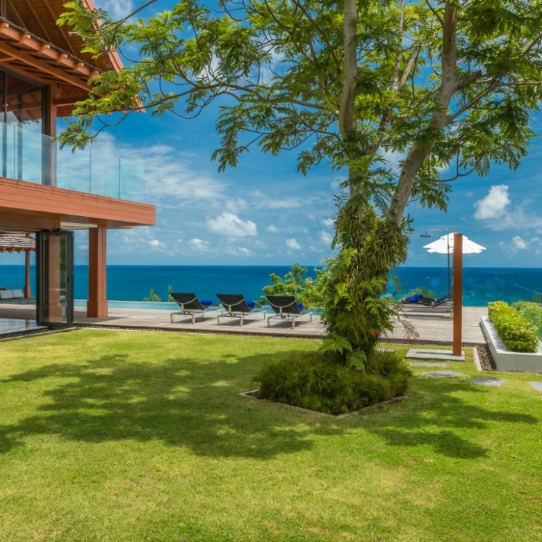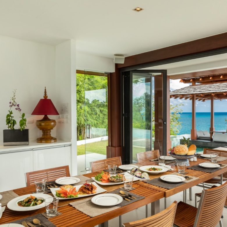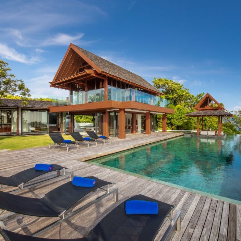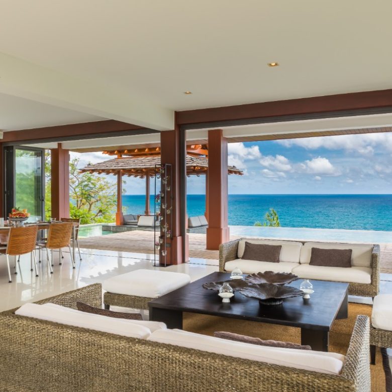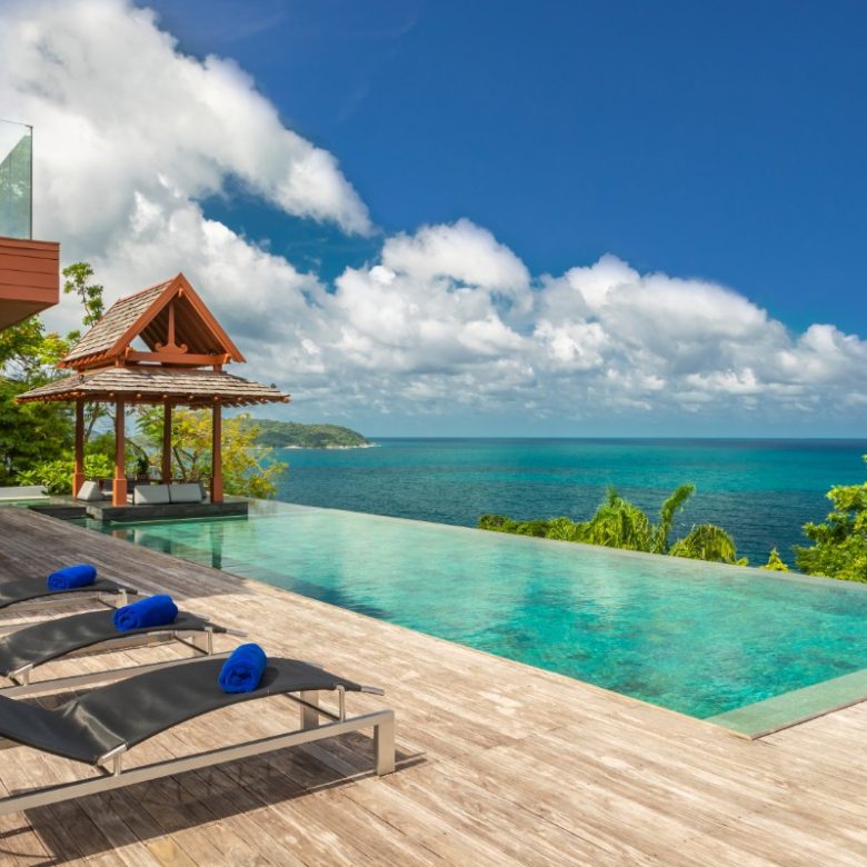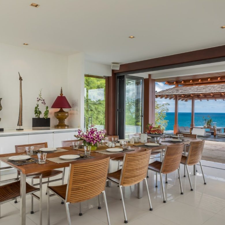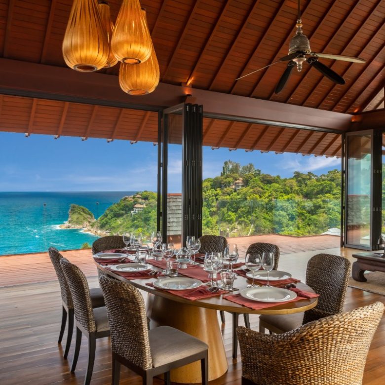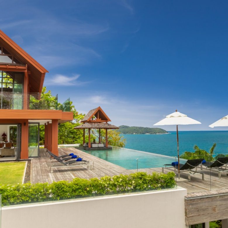 Villa Santisuk is a beautiful, five bedroomed contemporary styled villa with clear Asian influence, situated at the top of a private oceanfront estate facing west towards the open ocean with amazing 360 degree and sunset views over the Andaman Sea.