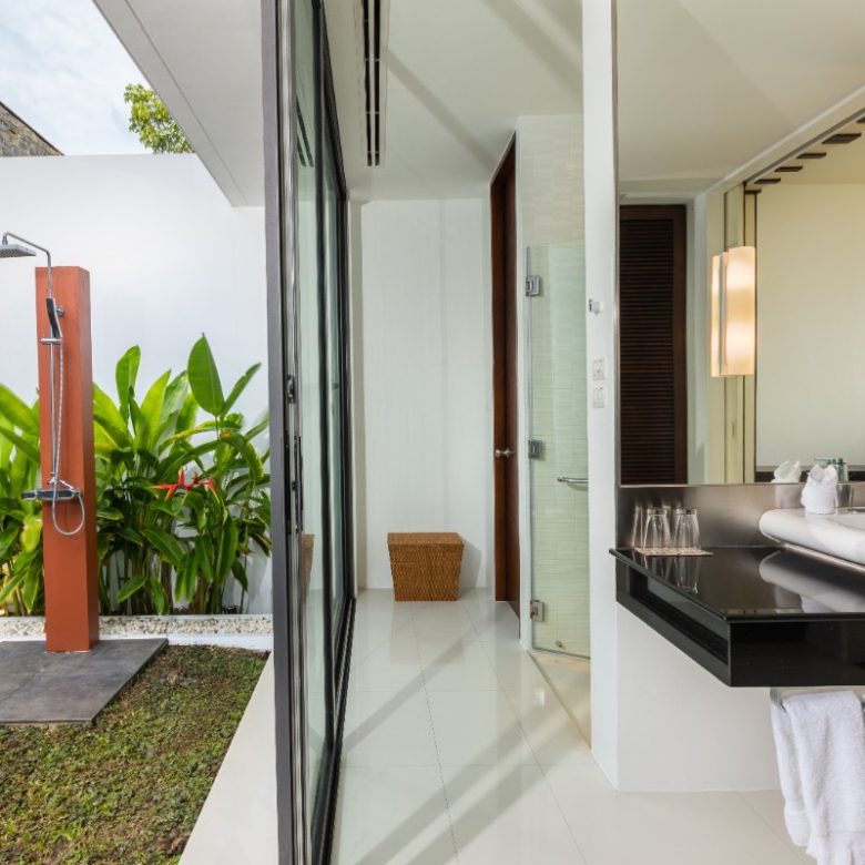 High 3m+ ceilings and generous room sizes project the luxury of space even within the intimate and private bedroom areas. Extensive water features from the impressive entrance walkway to the âin waterâ sala area at the southern end of the pool, to the outdoor spa showers in the bathroom areas several with cascading waterwalls promote a sense of tranquility and give the villa its name; âSantisukâ