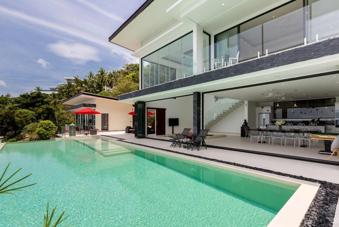 As you enter the villa grounds you are surrounded by verdant greenery, soaring bamboo plants, coconut trees and huge granite boulders. They are a sight to behold and the garden has been landscaped to incorporate all the natural, wonderous elements that Koh Samui has to offer. Walking onto the pool terrace is an eye-opener. The elevated views are spectacular and you can easily see the tiny island of Koh Matlam in Chaweng bay directly in front of you; Chaweng Lake in the interior; just beyond that, the small islets of Koh Som; and the towering hills of Koh Phangan in the distance. Itâs a vista you will never grow tired of, nor of watching the ocean change colour in the morning as the sun arcs across the sky. Undoubtedly much of your time will be spent outdoors and the terrace around the 18 metre infinity pool has plenty of space to relax. There are sunbeds with umbrellas, beanbags, cushioned outdoor chairs and a covered sala with an outdoor dining table and chairs. Next to that is a large modern barbecue for keen al fresco chefs and there is a nearby washroom.