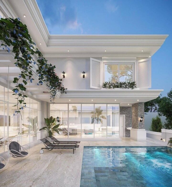 The villa has parking space for 2 cars. On the ground floor there is a European kitchen with living room and dining room. There is a guest toilet and a laundry room. The terrace of 26.50 sqm invites you to sunbathe and the pool has 21 sqm.
