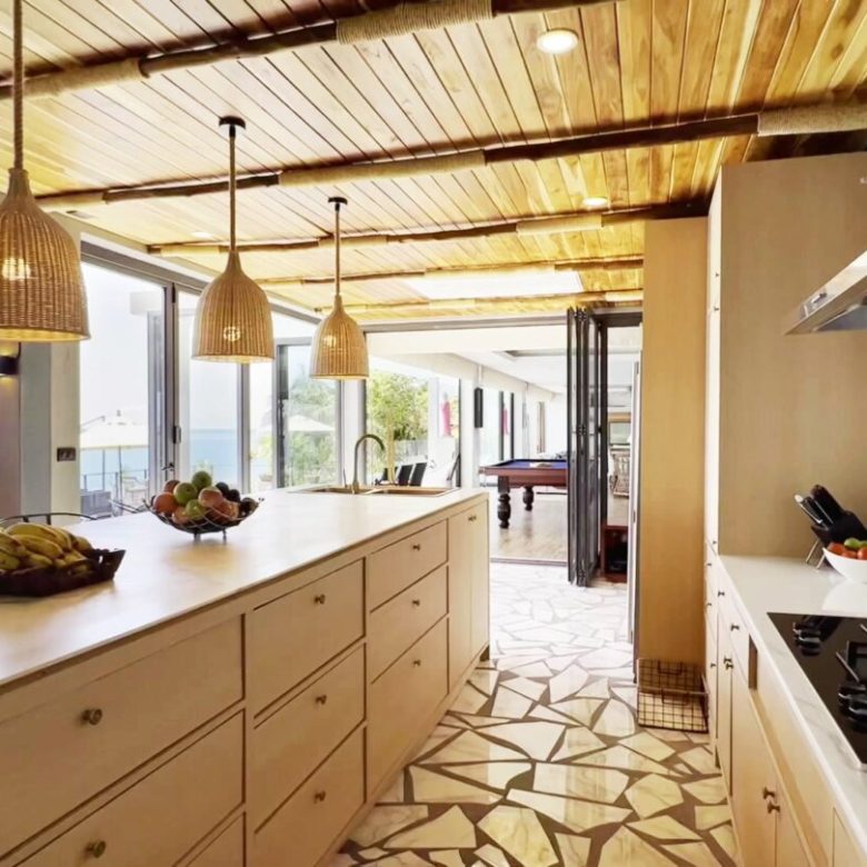 As you arrive at the pool level, a limestone tiled pathway leads from the bedroom past a koi carp pond to the stylish and quite impressive living room and pool deck with sea views.