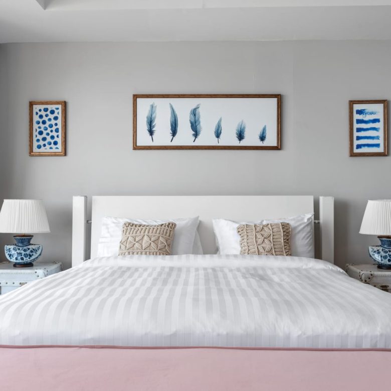 The fourth bedroom has a king-size four-poster bed surrounded by intricate designs of modern contemporary artwork and ornaments. A large walk-in closet next to a bathroom with terrazzo bathtub and terrazzo double sinks completes the generous space. The fifth bedroom with bunk beds is located next to this bedroom at pool level.